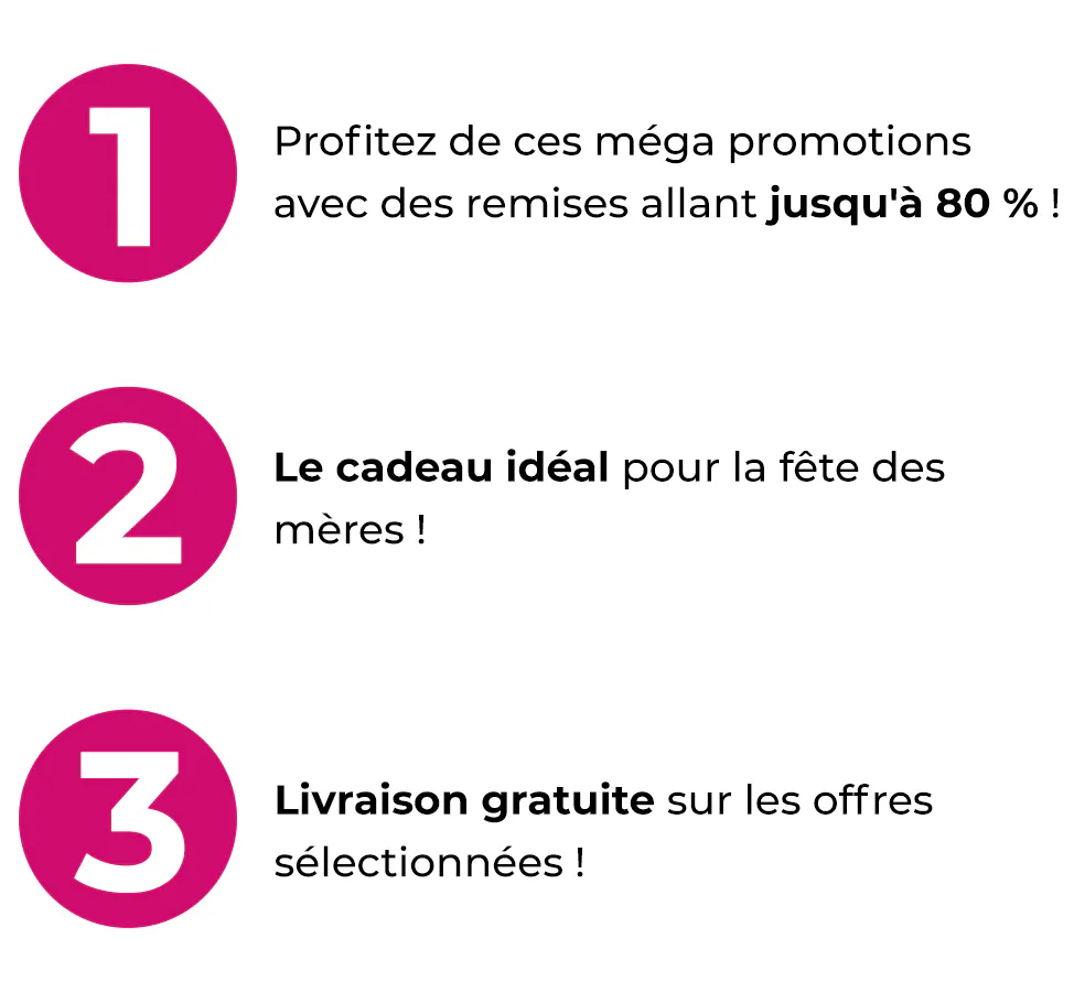 Profitez de l'une de ces super offres et faites plaisir à votre mère, à votre amie ou à vous-même avec des réductions allant jusqu'à 80 % sur des produits sélectionnés !